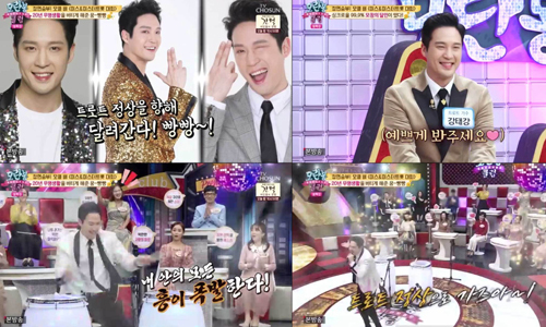 특히 강태강은 TV조선 ‘내일은 미스터 트롯’에 출연해 선보였던 박상철의 ‘빵빵’ 무대를 파워풀한 난타 퍼포먼스와 함께 재현하며 넘치는 끼를 방출했다. 눈을 뗄 수 없는 화려한 퍼포먼스에 함께 출연한 패널들은 하트 팻말을 들며 열광했다.