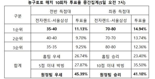 자세한 투표율을 살펴보면, 양팀의 10점 이내 박빙은 35.50%를 기록했고, 홈팀 전자랜드의 승리 예상은 23.40%로 나타났다.