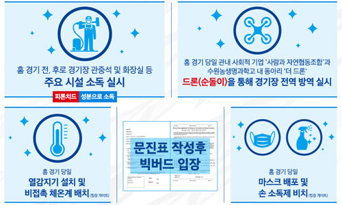 수원시와 삼성전자의 협조로 열감지기와 비접촉 체온계를 확보했으며, 경기 당일 각 게이트마다 설치한다. 손소독제와 마스크 역시 수량을 확보하여 각 게이트별로 배치할 예정이다. 코로나19 대응과 관련한 문진표 작성으로 자칫 입장이 지연될 것에 대비하여, 홈페이지 및 SNS에 양식을 올려 미리 작성해서 원활한 입장을 유도할 계획이다.