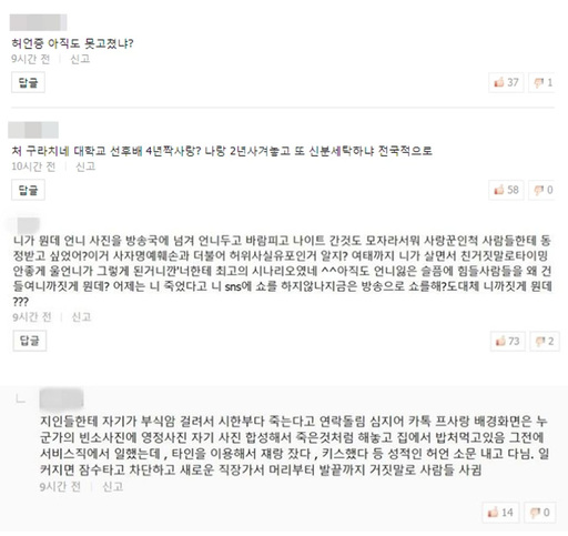 누리꾼들은 “또 이러고 다니네. 사기도 제발 적당히 쳐라”, “거짓말하네. 대학교 선후배 4년 짝사랑? 나랑 2년 사겨 놓고 또 전국적으로 신분 세탁하냐”, “너로 인해 농락당한 사람이 몇 명이냐. 이젠 고인까지 건드냐? 남의 빈소 사진에 자기 사진 합성해서 죽은척하더니” 등의 댓글을 달았다.