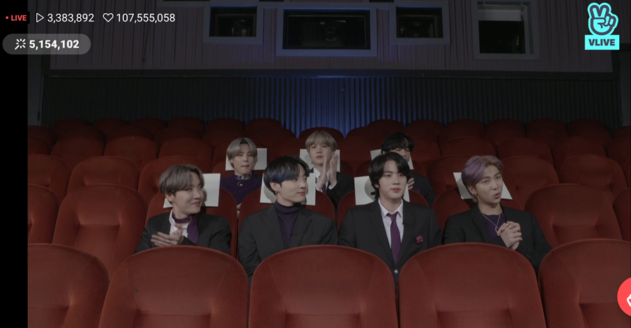 21일 정오 극장 콘셉트의 장소에서 네 번째 정규앨범 ‘MAP OF THE SOUL : 7’ 발매 기념 V라이브 ‘보.라.해(보이는 라이브 해요)’를 진행했다.