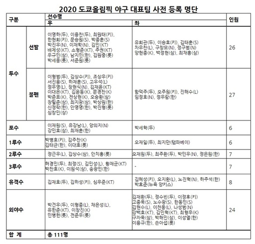 이날 회의에는 김시진 기술위원장을 비롯해 기술위원 전원이 참석해 총 111명의 선수를 확정했다. 이번 명단은 최종 엔트리 선발을 위한 사전 등록 명단으로, 이 선수들 내에서만 올림픽 최종 엔트리 구성이 가능하므로 인원 제한 없이 폭넓게 검토해 선발했다.