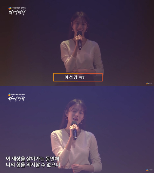 그러면서 이성경은 “영상을 통해서도 예배할 수 있게 하신 하나님의 은혜에 감사드린다”며 “이럴 때일수록 더욱 영상 특별기도회를 통해 이 땅의 두려움이 가득한 곳곳에 소망의 빛 하나님의 사랑을 전할 수 있는 모두가 되기를 간절히 기도한다”고 덧붙였다.