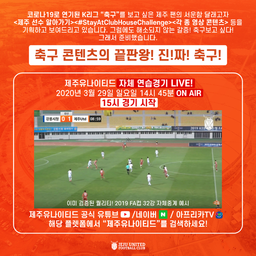 제주 관계자는 “코로나19 확산으로 K리그 개막이 연기된 상황에서 팬들이 자체 연습경기 온라인 생중계를 통해 조금이나마 축구에 대한 갈증을 해소했으면 좋겠다. 많은 분들이 사회적 거리두기에 동참하고 있어 아쉽게도 직접 팬들과 호흡할 수 없지만 실제 타 팀과의 경기 생중계를 보는 듯한 몰입감을 주기 위해 최선을 다해 준비하겠다”라고 말했다.