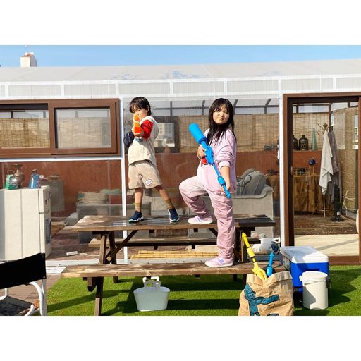 공개된 사진 속에는 집 옥상에서 뛰어놀며 물총놀이를 즐기는 ‘소다 남매’ 모습이 담겼다.