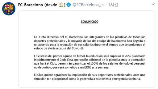 바르사도 마찬가지. 이에 선수단을 포함해 임원진까지 임금 삭감을 결정했다. 바르사는 “코로나19 사태로 불거진 상황에 따라 구단 임원들이 임금 삭감에 동의했다”며 “축구팀의 경우 1군 선수들은 기존 임금의 70% 이상을 삭감하기로 합의했다”고 전했다.