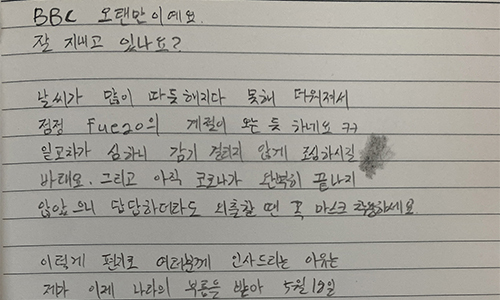 이렇게 편지로 여러분께 인사드리는 이유는 제가 이제 나라의 부름을 받아 5월 18일 입대를 하게 되어서예요. 가기 전에 얼굴 볼 수 있는 자리를 만들고 싶었지만 아쉽게도 이렇게 편지로만 인사하게 되었네요.