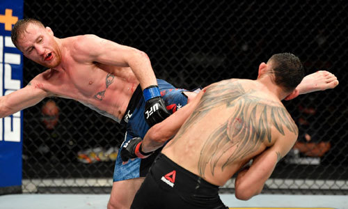 사진설명: 게이치에게 일격을 당한 퍼거슨(오른쪽)이 이제는 하빕을 응원해야 하는 처지에 놓였다. 사진은 퍼거슨이 게이치의 킥을 피하는 모습.