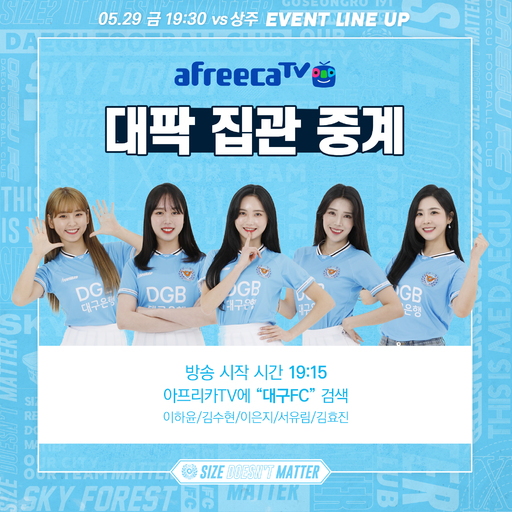 ▲아프리카TV로 함께하는 대팍 집관 중계!=대구는 오는 29일(금) 오후 7시 15분부터 아프리카TV 대구FC 채널에서 대팍 집관 중계를 실시한다. 홈경기 전에는 리카가 관전 포인트를 소개하고, 오늘 경기 첫 골의 주인공을 맞추는 문자 퀴즈도 진행한다. 경기 중에는 대구FC 치어리더 팀, 리포터 효짱, 마스코트 빅토, 리카와 함께 중계를 시청하며 대구를 응원한다. 하프타임에는 효짱의 LIVE 퀴즈쇼에 문자로 참여하며, 정답을 맞춘 팬 중 추첨을 통해 DGB대구은행파크에 입점해있는 피자팜비어, 트위첼, 김스타치킨 등 제품교환권을 증정할 계획이다.
