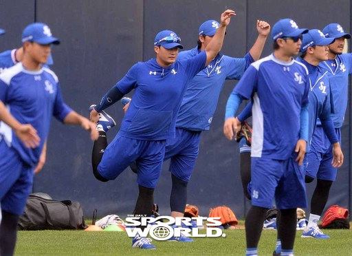 [스포츠월드 김두홍 기자]프로야구 삼성 투수 오승환(가운데)이 2일 잠실구장에서 열린 LG와의 경기에 앞서 훈련을 하고 있다. 잠실=김두홍 기자 kimdh@sportsworldi.com 2020.06.02.