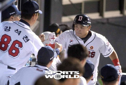 [스포츠월드 김두홍 기자]프로야구 두산 최주환(오른쪽)이 18일 잠실구장에서 열린 삼성과의 경기 5회말 2사 3루때 동점 투런홈런을 때리고 동료들의 축하를 받고 있다. 잠실=김두홍 기자 kimdh@sportsworldi.com 2020.06.18.