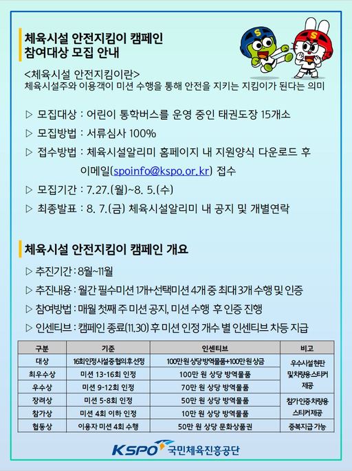 [스포츠월드=권기범 기자] 국민체육진흥공단(이사장 조재기)이 소규모 체육시설의 자율적이고 적극적인 안전관리 문화를 정착시키기 위해 ‘체육시설 안전지킴이 캠페인’을 시행한다.