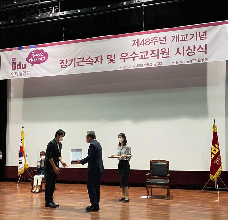공개된 사진 속에는 신현준이 교수로 근무 중인 인덕대학교 강당에서 ‘장기근속자 및 우수교직원’을 대상으로 수여하는 상을 받는 모습이 담겼다.