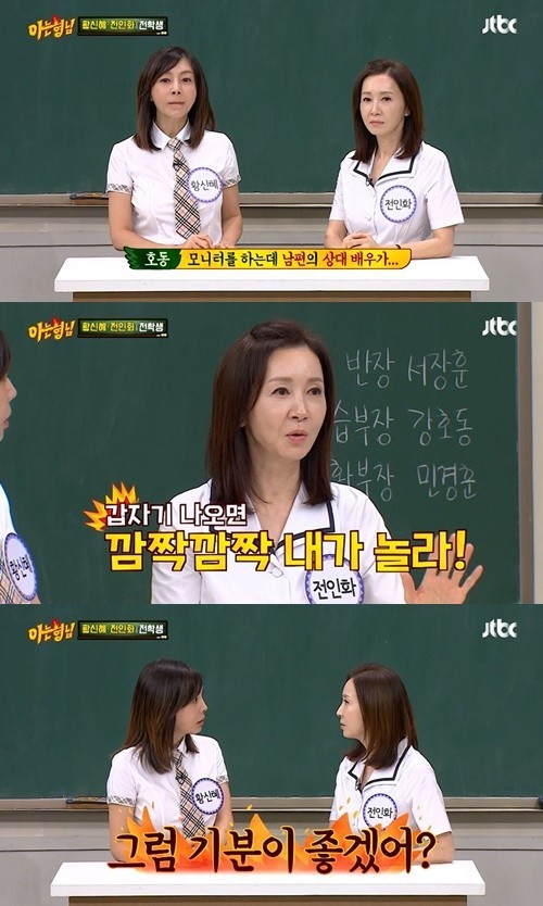 26일 방송된 JTBC 예능프로그램 ‘아는 형님’에서는 KBS2 주말드라마 ‘오! 삼광빌라!’에 출연 중인 배우 황신혜, 전인화가 전학생으로 출연했다.