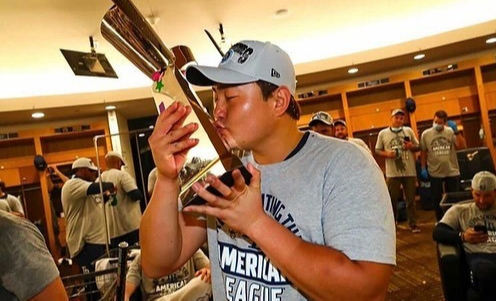 사진=최지만 SNS (최지만이 생애 첫 월드시리즈를 앞두고 자신감을 드러냈다. 사진은 ALCS 트로피를 들고 있는 최지만의 모습.)