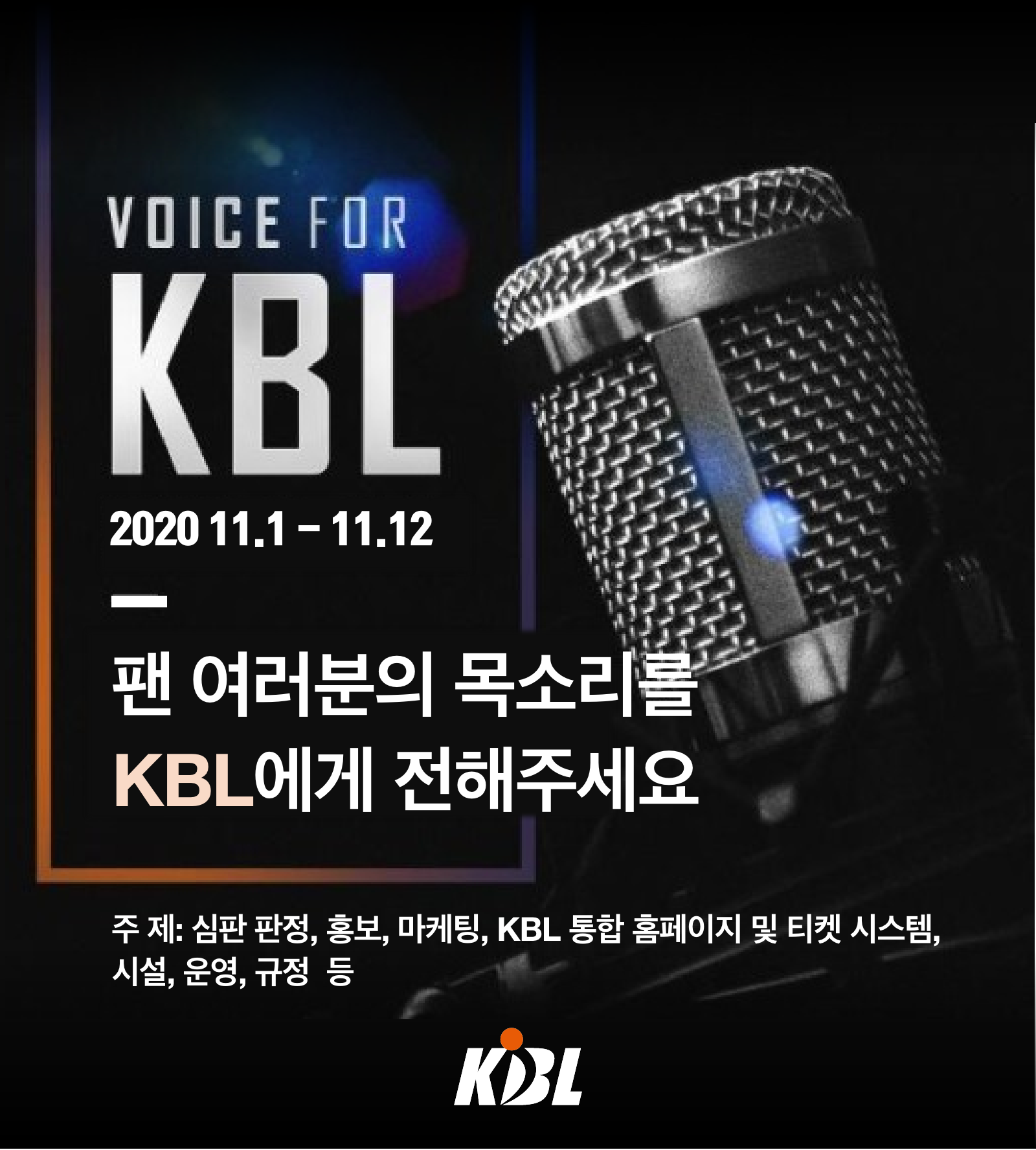 ‘VOICE FOR KBL’은 11월 1일부터 11월 12일까지 총 12일간 KBL 통합 웹사이트와 애플리케이션을 통해 팬들의 의견을 수렴한다. 건실한 의견을 개진한 팬들을 초청해 별도 좌담회를 진행한다.