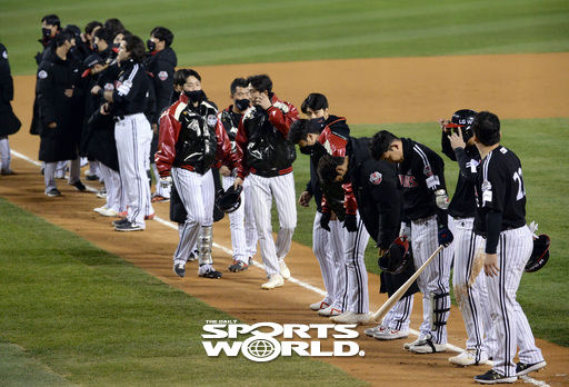 [스포츠월드 김두홍 기자]프로야구 LG 선수들이 4일 잠실구장에서 열린 'KBO 2020 포스트시즌 준플레이오프 1차전' 두산과의 경기에서 패한 뒤 팬들에게 인사를 하고 있다. 잠실=김두홍 기자 kimdh@sportsworldi.com 2020.11.04.