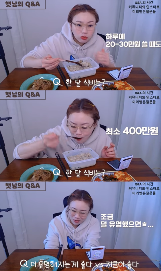[스포츠월드=유수연 온라인 뉴스 기자] 먹방 유튜버 입짧은햇님이 구독자들의 질문에 답변하는 시간을 가졌다.