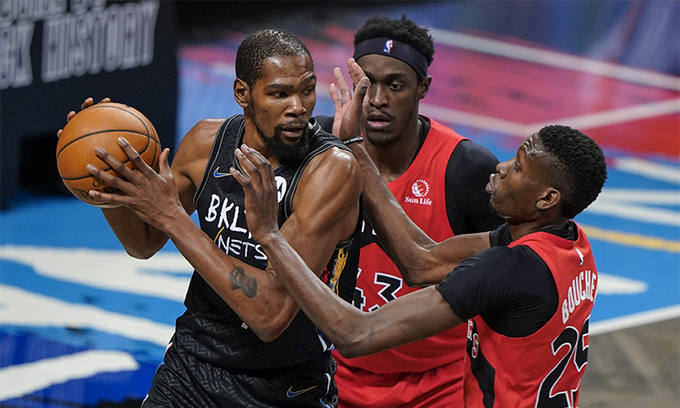 6일(한국시간) 미국 뉴욕주 브루클린의 바클레이스 센터에서 벌어진 토론토 랩터스와의 2020~2021 NBA 정규리그 홈경기. 듀란트는 선발 명단에 이름을 올리지 못했다. NBA 통산 867경기를 뛰는 동안 선발에서 듀란트가 빠진 건 이번이 처음이다.
