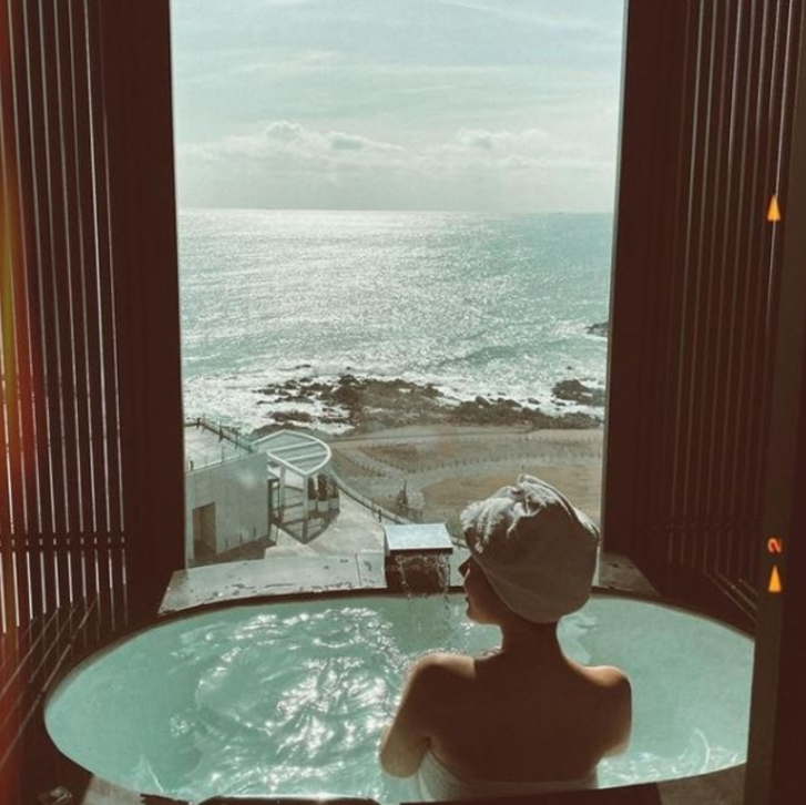공개된 사진에는 시원한 바다 뷰가 돋보이는 부산의 한 특급 호텔에서 반신욕을 하는 나비의 모습이 감겼다. 임신 7개월 차에 접어든 나비는 럭셔리한 호텔에서 태교 여행을 즐기고 있어 부러움을 자아낸다.