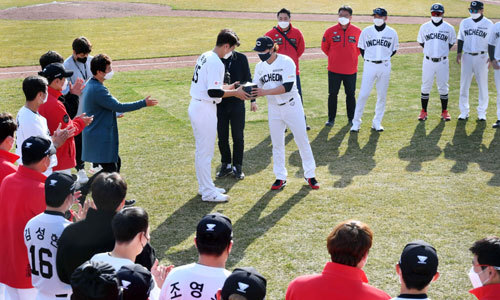 ‘추추트레인’ 추신수(39·SSG)가 드디어 팀에 합류했다. 지난달 25일 입국한 추신수는 경남 창원에서 2주간 자가격리를 거쳤다. 11일 정오를 기점으로 해제됐고 곧바로 선수단이 있는 부산 사직구장으로 향했다. 인천군 유니폼을 입고 첫 상견례를 한 추신수는 이 자리에서 이태양에게 깜짝 선물을 전했다. 빨간색 시계였다. 그것도 수천만 원 상당의 스위스 명품 시계 브랜드 제품이었다. 추신수는 “등번호 17번을 양보해줘서 정말 고맙다”고 재차 마음을 표했다.