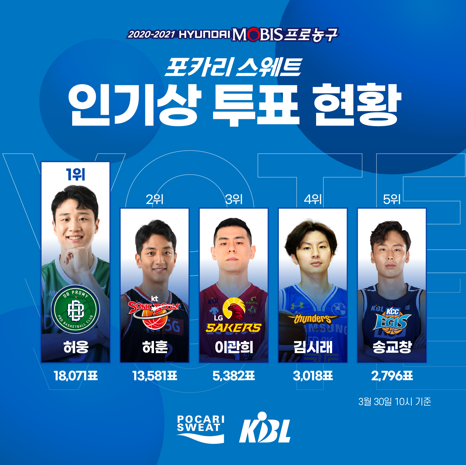 [스포츠월드=김진엽 기자] 2020∼2021 현대모비스 프로농구 최고의 인기 선수를 선정하는 ‘포카리스웨트 인기상’ 투표에서 DB 허웅이 1만 8071표로 30일 오전 10시 기준 중간집계 1위를 차지했다.