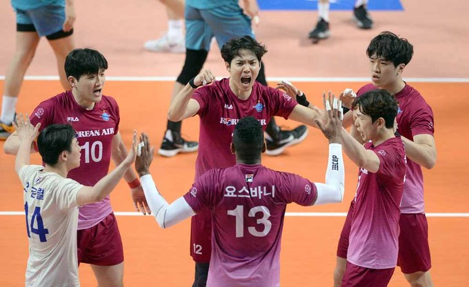 [SW포토]환호하는 대한항공 기사입력 2021-04-15 16:30:50 기사수정 2021-04-15 16:30:49 글씨 크기 선택 가장 작은 크기 글자 한 단계 작은 크기 글자 기본 크기 글자 한 단계 큰 크기 글자 가장 큰 크기 글자 [스포츠월드 김두홍 기자]남자프로배구 대한항공 선수들이 15일 장충체육관에서 열린 우리카드와의 챔피언결정전 4차전에서 득점 후 환호하고 있다. 장충체=김두홍 기자 kimdh@sportsworldi.com 2021.04.15. [ⓒ 세계비즈앤스포츠월드 & sportsworldi.com, 무단전재 및 재배포 금지] 메뉴보기 페이스북 공유 트위터 공유 url 공유 더보기