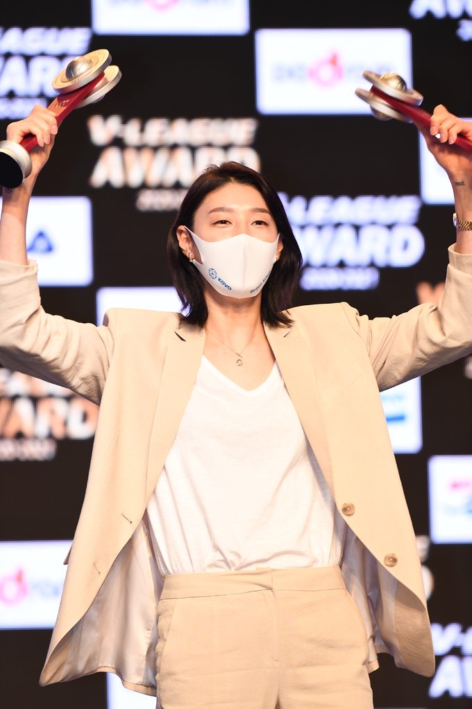 [SW포토]김연경,'내가 MVP' 기사입력 2021-04-19 18:56:27 기사수정 2021-04-19 18:56:26 글씨 크기 선택 가장 작은 크기 글자 한 단계 작은 크기 글자 기본 크기 글자 한 단계 큰 크기 글자 가장 큰 크기 글자 [스포츠월드 김두홍 기자]여자프로배구 흥국생명 김연경이 19일 용산구 그랜드하얏트서울 호텔에서 열린 도드람 2020~2021 V-리그 시상식에서 정규리그 MVP로 뽑혔다. kimdh@sportsworldi.com / 사진=KOVO [ⓒ 세계비즈앤스포츠월드 & sportsworldi.com, 무단전재 및 재배포 금지] 메뉴보기 페이스북 공유 트위터 공유 url 공유 더보기