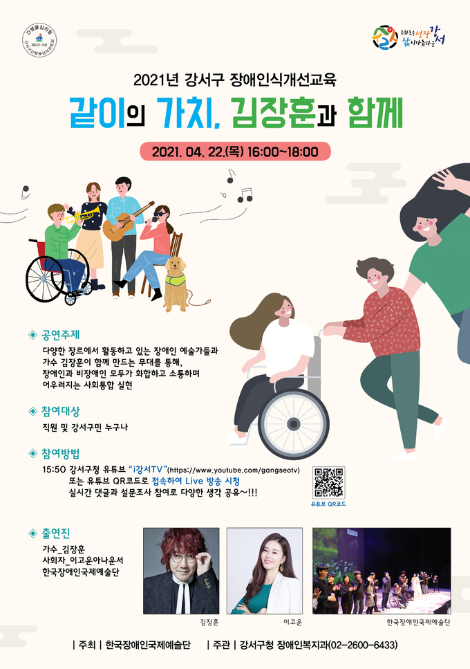 이번 교육은 김장훈과 다양한 장르의 장애인 예술가들을 초청해 온택트 공연 형식으로 진행되며, 강서구청 유튜브 채널(i강서TV)을 통해 생중계된다.