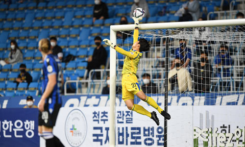 공교롭게도 실수를 범한 이는 2021시즌 첫 선발 기회를 잡은 골키퍼 김동헌이었다. 김동헌은 2019시즌 인천과 연을 맺으며 프로 무대에 발을 내디뎠지만 데뷔전을 치르지는 못했다. 이듬해 첫 경기를 소화하긴 했으나 로테이션 멤버에 그쳤다. 3경기 출전이 전부였다.