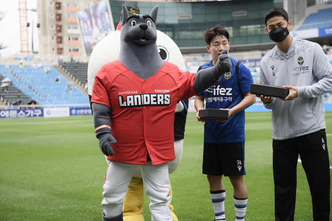 프로축구 K리그1 인천유나이티드 홈경기장에 프로야구 SSG 랜더스 마스코트 랜디가 떴다. 어떻게 된 사연일까.
