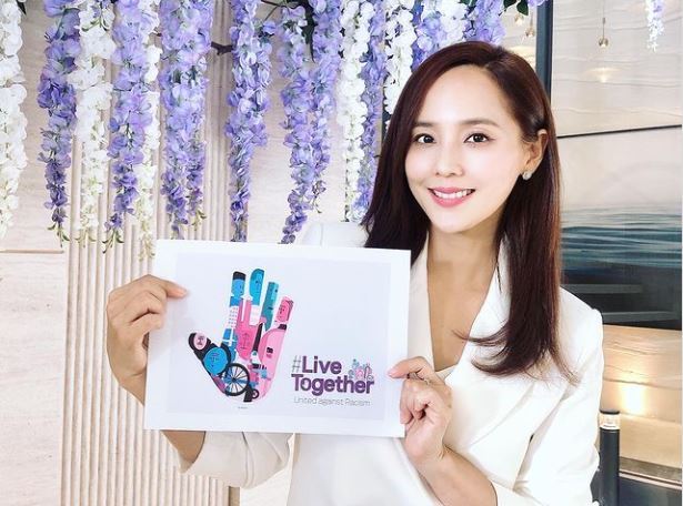 사진 속 유진은 화이트 블라우스를 입고 ‘Live together’ 캠페인 문구 적인 종이를 들고 미소를 짓고 있다. 특히 여신 같은 미모가 눈길을 끌고 있다.