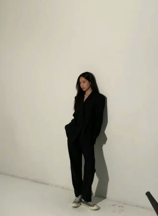 손나은은 블랙 슈트와 컨버스를 매치해 시크한 분위기를 뽐내고 있다. 또한 남다른 비율을 과시하고 있어 눈길을 끈다.