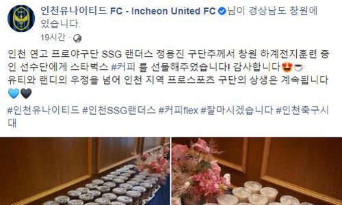 SSG 팬들 사이에서 ‘용진이형’으로 통하는 정용진 구단주는 지난 2월 제주에서 스프링캠프를 진행했던 SSG 선수단에 매일 스타벅스 커피를 제공하며 응원한 바 있다. 이번에는 인천유나이티드를 위해 커피를 보냈다. 종목은 달라도 같은 인천 연고 구단은 물론 과거 양 구단 마스코트인 유티와 랜디가 맺은 인연의 연장선이다.