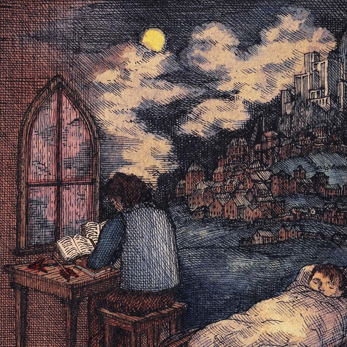 빈티지한 감성이 깃든 삽화 속에는 포근하게 잠든 아이를 뒤로 한 채 독서에 열중하는 어떤 이의 뒷모습이 담겨 있다. 보름달이 뜬 밤하늘과 어둠에 잠식된 작은 마을이 함께 어우러지며 차분한 느낌을 자아냈다.
