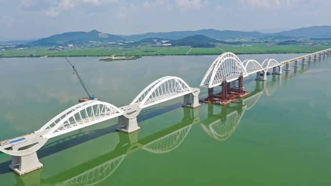 아치교량은 총 5개의 아치 구조물로 구성됐다. 가장 큰 아치 양쪽으로 1681톤의 아치 2개와 1255톤의 아치 2개가 연결되는 모습이다. 이번에 설치한 아치는 길이 155m, 높이 46.5m, 무게는 2726톤으로 가장 크다. 한강에 설치된 서강대교 아치교와 비슷한 규모다.