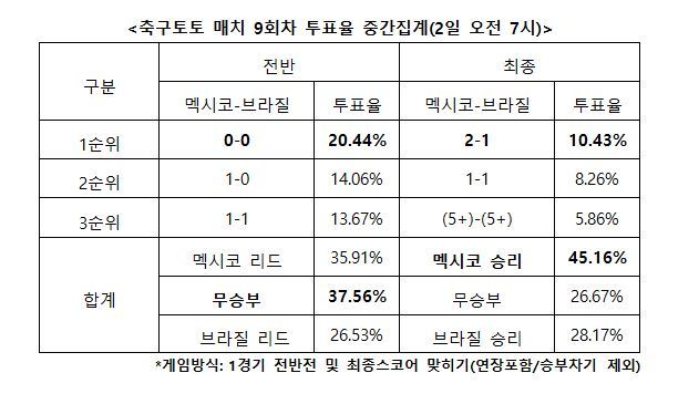 국민체육진흥공단이 발행하는 체육진흥투표권 스포츠토토의 수탁사업자 스포츠토토코리아가 오는 3일 오후 5시에 가시마(일본)에서 펼쳐지는 국제대회 4강전을 대상으로 한 축구토토 매치 9회차 투표율을 중간 집계한 결과, 45.16%의 축구팬이 멕시코의 승리를 예상했다고 전했다.