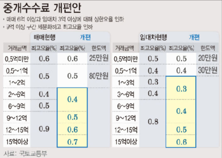 현행 3~6억원의 요율 상한은 0.4%에서 0.3%로 낮추고, 6억원 이상부터는 0.8%였던 요율 상한을 6~12억원, 12~15억원, 15억원 이상으로 구간을 쪼개 각각 0.4%, 0.5%, 0.6%로 낮추는 것이다.