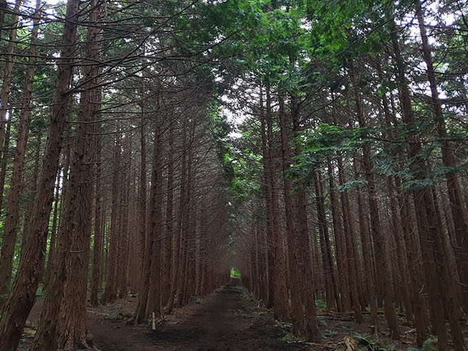 1차 목표지는 바농오름의 편백숲이다. 편백나무는 침엽수 중에서 피톤치드를 가장 많이 방출하는 것으로 알려졌다. 코로나19 사태로 마스크를 벗지 못하는 게 아쉬웠다. 길 가는 중간중간 주변의 자연을 활용한 다양한 체험에 나선다.