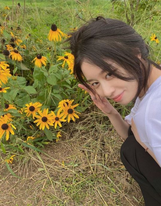 공개된 사진 속 편안한 옷차림의 지연은 해바라기가 만개한 길가에서 포즈를 취하는 모습이다. 특히 대충 올려 묶은 듯한 머리에도 뚜렷한 이목구비와 빛나는 미모로 시선을 고정시켰다.