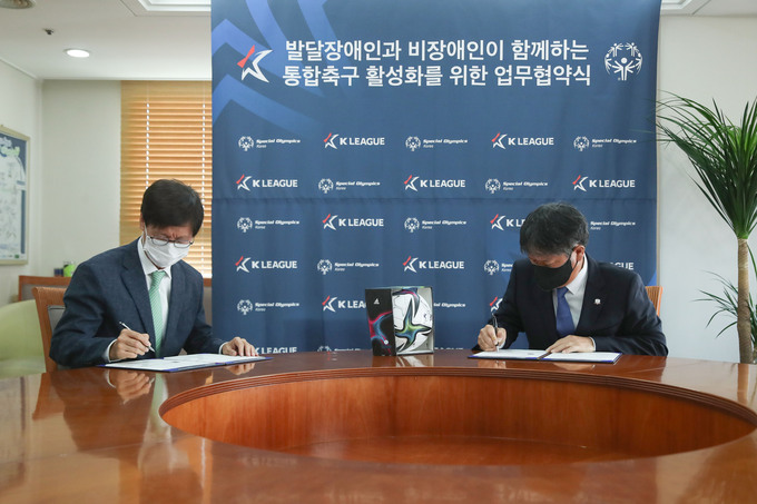 한국프로축구연맹(이하 연맹)과 스페셜올림픽코리아(이하 SOK)가 지난 8일 오전 축구회관에서 스페셜올림픽 통합축구 활성화를 위한 업무 협약을 체결했다.