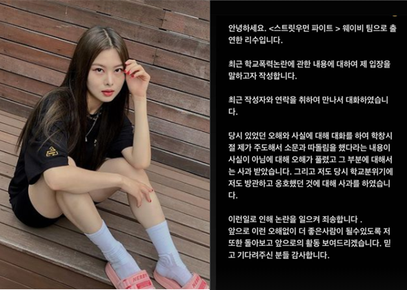 엠넷 ‘스트릿 우먼 파이터’에 출연했던 댄스 크루 웨이비 멤버 리수가 학교폭력 의혹 관련 입장을 전했다.