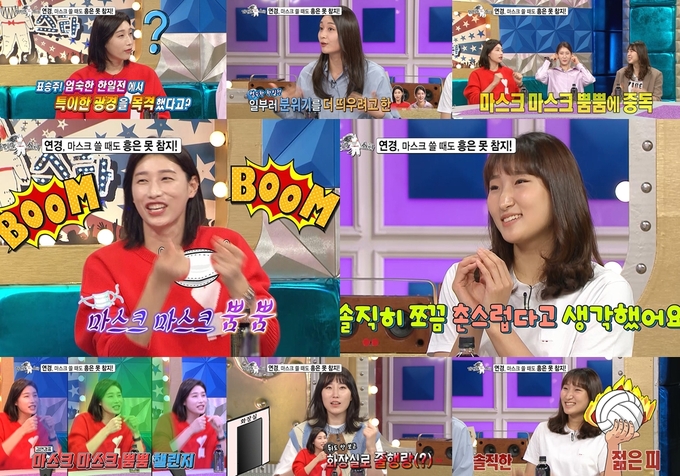 이때 MC 유세윤은 “1~2명은 ‘마스크 마스크 뿜뿜 챌린지’를 싫어했을 것”이라고 운을 띄웠다. 그러자 김연경에게 지목을 당한 박정아는 “긴장하면 화장실을 자주 가야 된다. 시합 전에는 무조건이다. 언니들 마스크 할 때 뒤도 안 보고 뛰어갔다”며 솔직하게 고백해 현장을 초토화시켰다.
