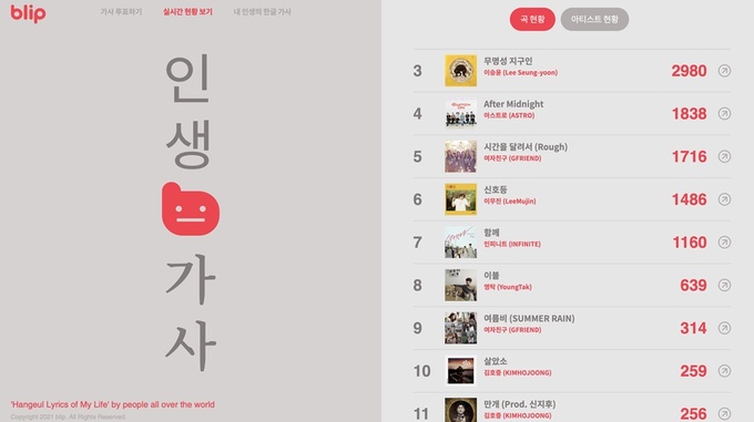 최근 블립의 ‘내 인생의 한글 가사’ 공모 페이지(이하 인생 가사)가 정식 오픈된 후 약 3만명이 넘는 많은 네티즌들이 적극적으로 참여하며 뜨거운 관심을 보이고 있다.