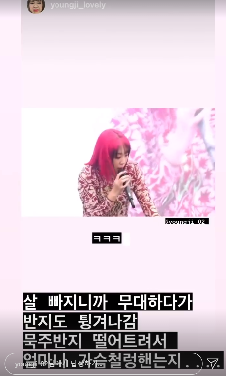 17일 이영지는 자신의 인스타그램 스토리에 “살 빠지니까 무대 하다가 반지도 튕겨 나감. 묵주 반지 떨어트려서 얼마나 가슴 철렁했는지”라는 글과 함께 짧은 영상 한 개를 게재했다.