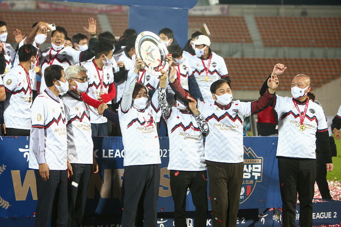 프로축구 K리그2 우승을 확정 지은 김천이 전남전 홈경기에서 승리 후 팬들과 함께 K리그2 우승 트로피를 들어 올렸다.