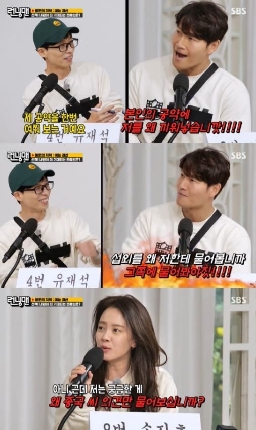 이를 지켜보던 송지효는 “궁금한 게 왜 종국 씨 의견만 물어보냐. 제 의견도 중요하지 않냐”면서 “전 싫다”고 못을 박았다.