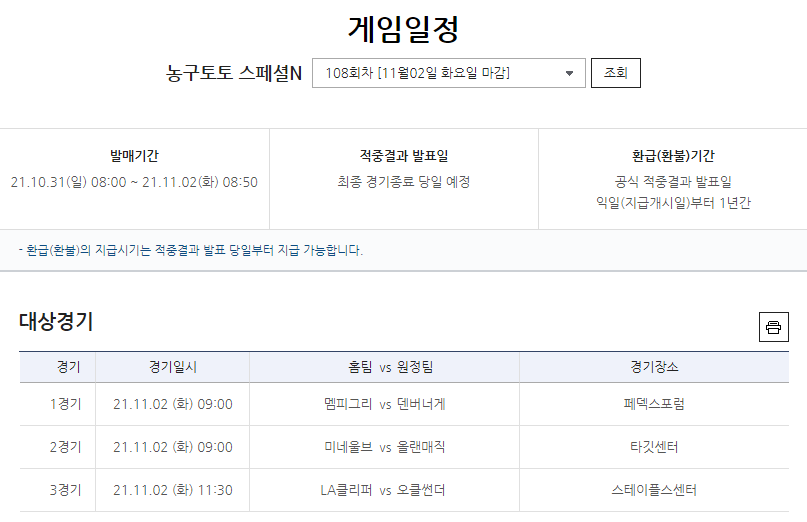 가장 먼저 마감되는 농구토토 스페셜N 108회차는 2일(화) 오전 9시에 페덱스포럼에서 펼쳐지는 멤피스-덴버(1경기)전을 비롯해 미네소타-올랜도(2경기), LA클리퍼스-오클라호마(3경기)전을 대상으로 발행되며, 첫 경기 시작 10분 전인 2일(화) 오전 8시50분까지 참여할 수 있다.
