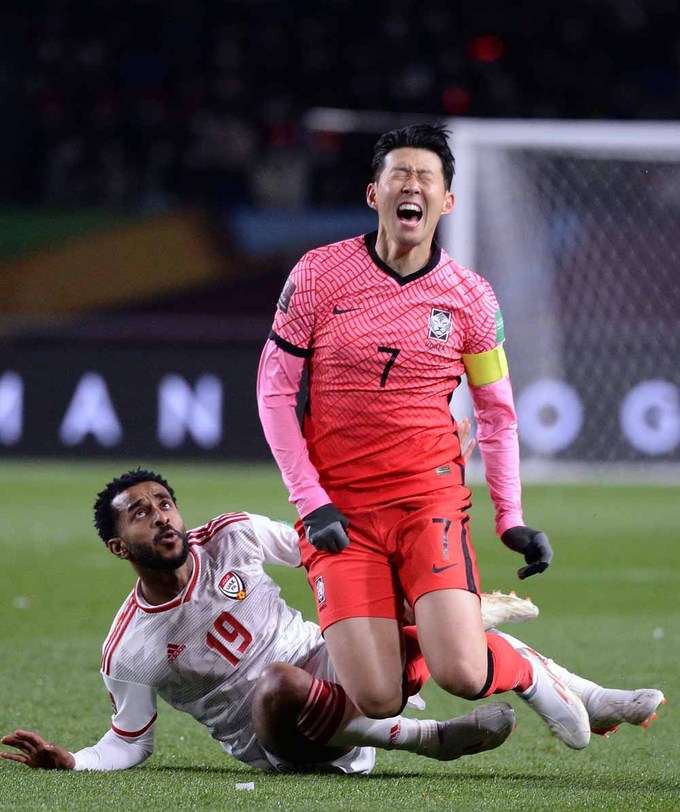 [SW포토]걸려 넘어지는 손흥민 기사입력 2021-11-11 20:23:33 기사수정 2021-11-11 20:23:32 글씨 크기 선택 가장 작은 크기 글자 한 단계 작은 크기 글자 기본 크기 글자 한 단계 큰 크기 글자 가장 큰 크기 글자 한국 축구대표팀 손흥민(위쪽)이 11일 고양종합운동장에서 열린 '2022 카타르 월드컵 아시아 최종 예선' 아랍에미리트와의 경기에서 상대 수비에 걸려 넘어지고 있다. 고양=김두홍 기자 kimdh@sportsworldi.com 2021.11.11. [ⓒ 세계비즈앤스포츠월드 & sportsworldi.com, 무단전재 및 재배포 금지] 메뉴보기 페이스북 공유 트위터 공유 url 공유 더보기