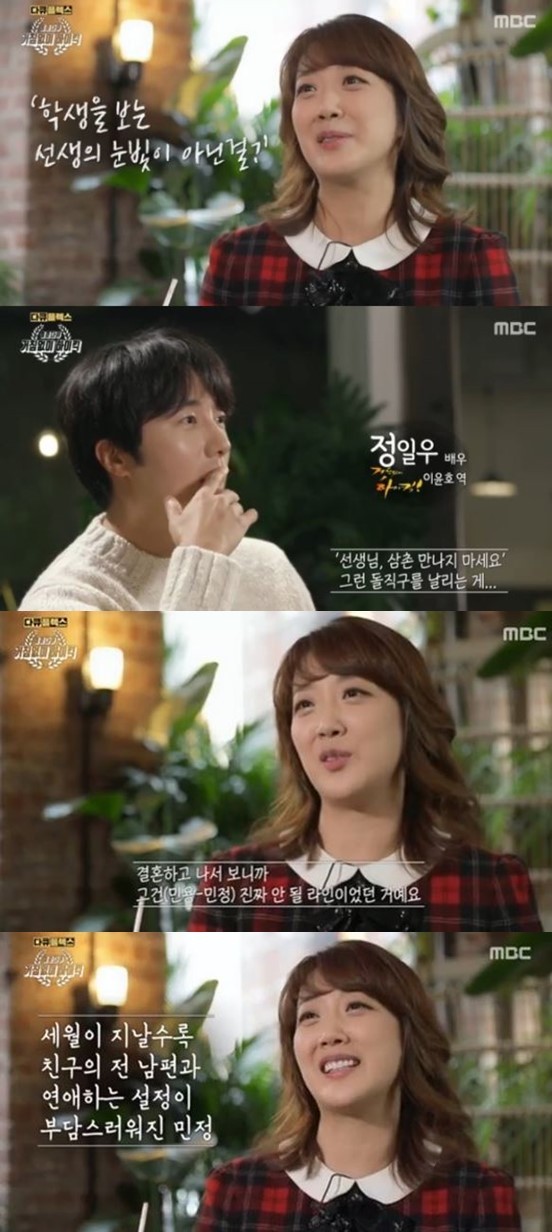 서민정은 극중 윤호(정일우 분)와 이민용(최민용 분)과 삼각관계였다. 서민정은 “뜻하지 않게 윤호가 제 옛날 남자친구가 도토리를 써서 돈을 받아주는 신이 있었다. 그때 그래도 학생인데 선생님을 위해 해주는 게 너무 멋있어서 가는 모습을 보며 ‘아’ 했는데 촬영 감독님이 그 신에서 ‘어 묘하다’ 이러시더라. ‘학생을 보는 선생의 눈빛이 아닌걸’ 이러셨다”며 비하인드를 전했다.